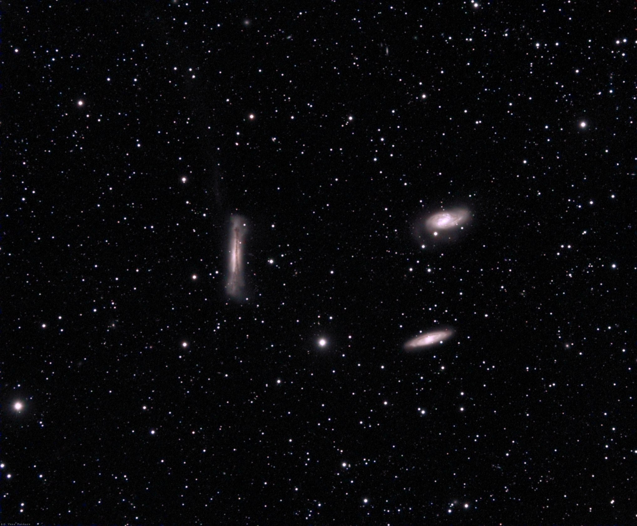 This photogenic trio of galaxies lies in the constellation Leo. Two of the galaxies were listed by Messier as M65 and M66. The third fainter edge-on spiral NGC3628 was discovered by William Herschel later on. The trio is believed to be situated at 35 million light years from Earth. NGC3628 holds also a nice photographic challenge for astroimagers. There is a very faint long tidal tail of stars coming out from the galaxy hinting from the past interaction with other members of the group.